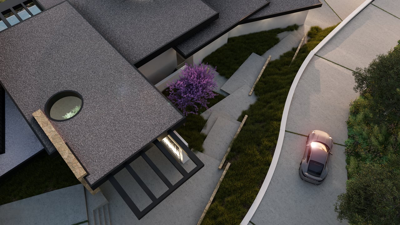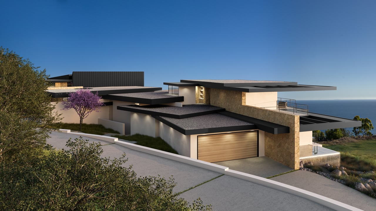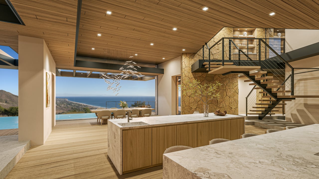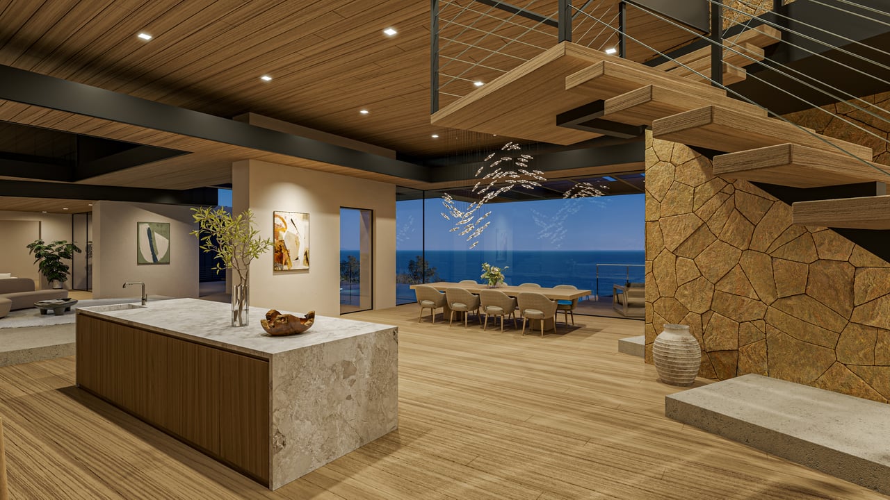 The design unfolds as a series of interconnected volumes, thoughtfully positioned to create a dynamic interplay between structure and landscape. Expansive walls of glass capture light throughout the day, while natural materials ground the home within its surroundings. The result is an environment that feels at once bold and effortless—architectural yet deeply livable.